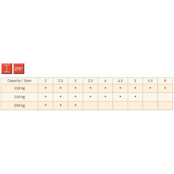 PFI MOB er en flytbar og dermed mobil udgave af den ‘normale’ PFI-model fra Comege. Frihøjden under udlæggeren (svingkranens arm) er PFI MOB’s største aktiv. Søjlesvingkranens I-bjælkeprofil muliggør derfor maksimal løftehøjde for f.eks. manuel håndkædetalje eller en eltalje samtidig bliver hele svingkranens højde holdes så lav som overhovedet muligt. PFI MOB er tilgængelig i kapaciteter fra 150 kg til 500 kg og denne svingkran har mulighed for 270° rotation.
