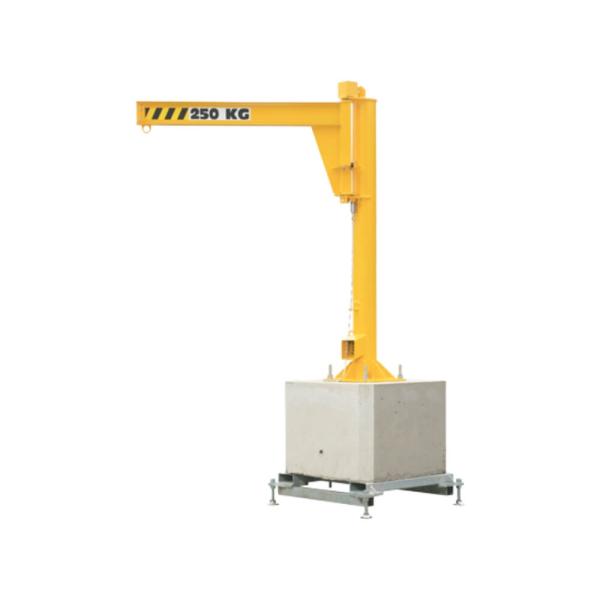 Svingkranen er monteret på en betonblok og flytning af kranen kan ske med kran via indbyggede transportringe eller med gaffeltruck via stativet kranen står i.